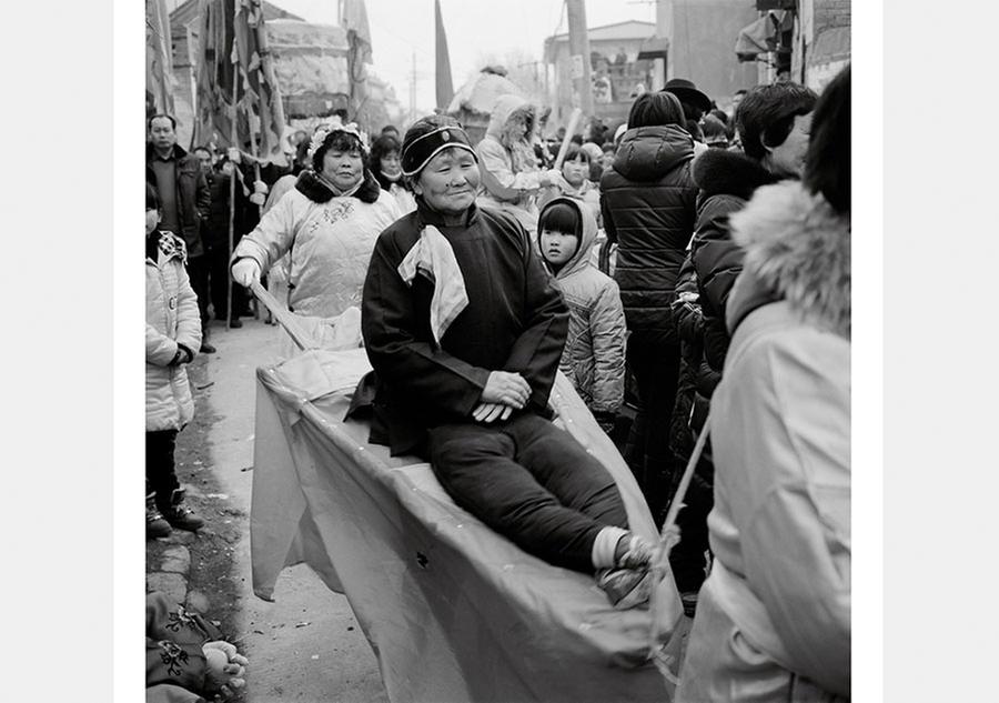 An older woman whose feet are bound rides in a cart to a temple fair. A temple fair is the carnival of the people on the Central Plain. [Photo by Hu Li/cpanet.org.cn] |