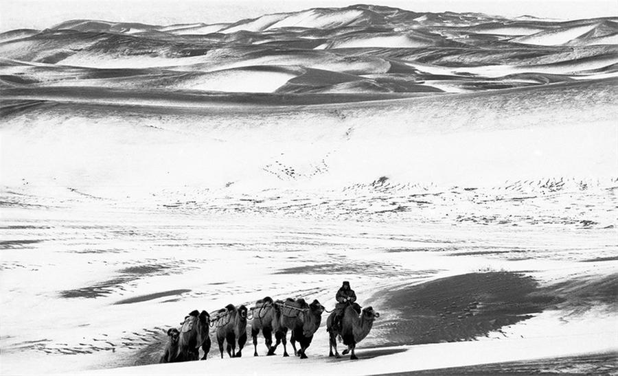 Camels walk across the Badain Jara Desert in North China after a snow storm in 1998. [Photo by Zuo Zhulin/cpanet.org.cn] |