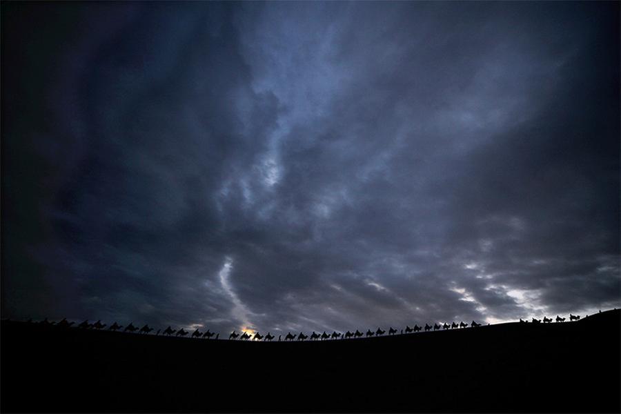 A long line of camels walk at dawn before a storm comes in the Badain Jara Desert in North China. The photo was taken in 2012. [Photo by Zuo Zhulin/cpanet.org.cn] |