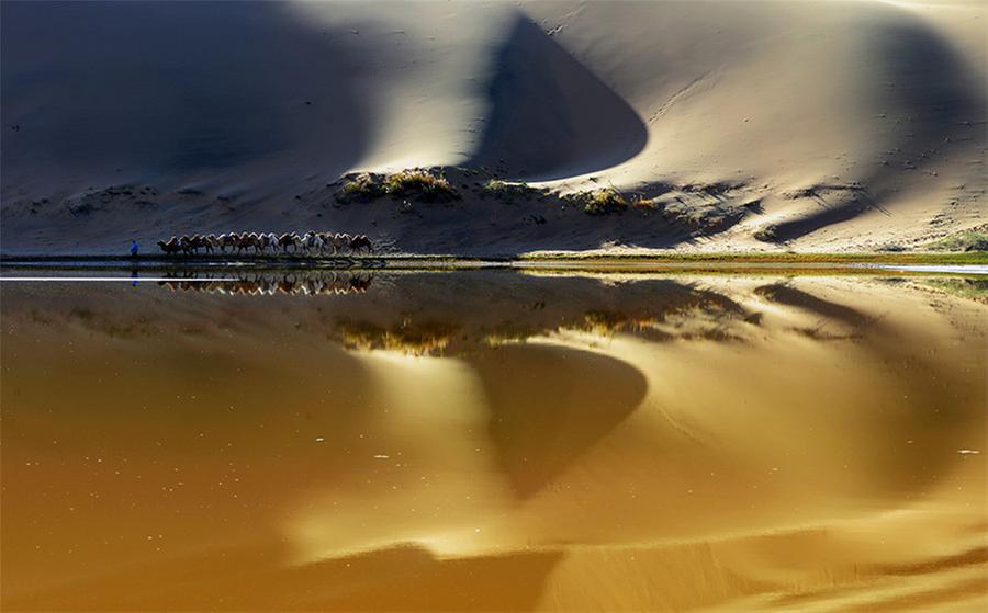 A group of camels walk beside a lake deep in the Badain Jara Desert in North China. The photo was taken in 2012. [Photo by Zuo Zhulin/cpanet.org.cn] |