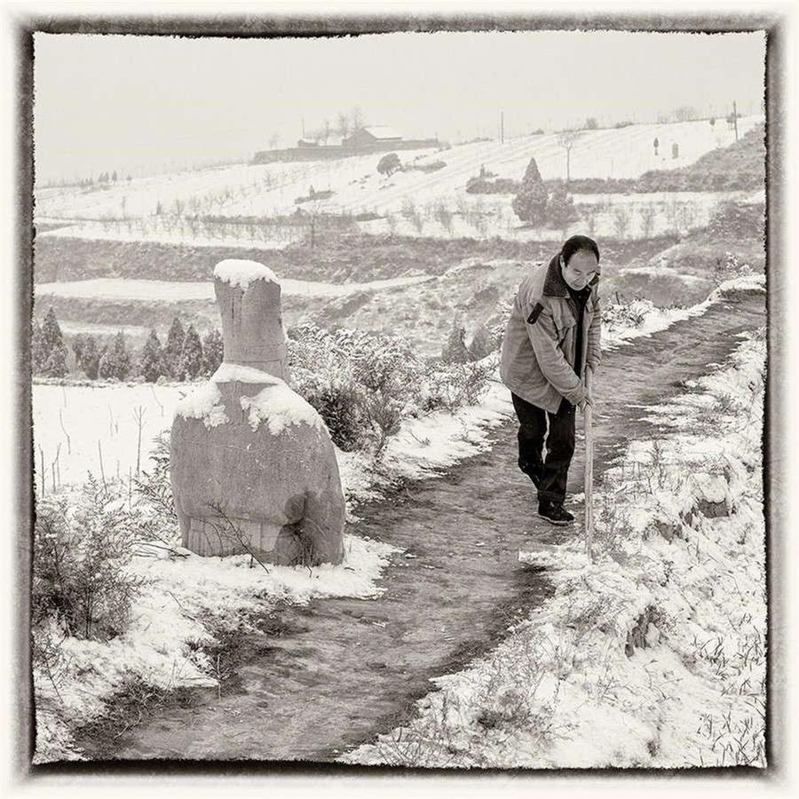 A famer clears the snow near the Jianling Mausoleum of the Tang Dynasty. [Photo by Deng Hai/cpanet.org.cn] |