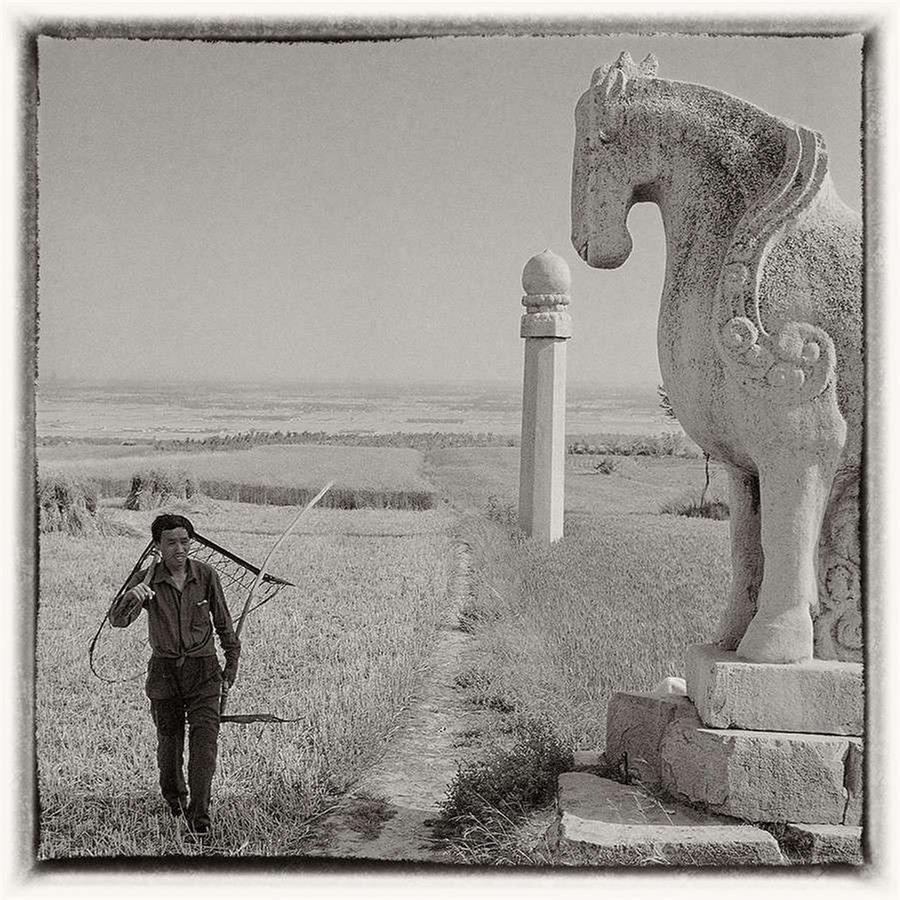 A famer walks past stone carvings of the Chongling Mausoleum, the tomb of Emperor Dezong of the Tang Dynasty. [Photo by Deng Hai/cpanet.org.cn] |