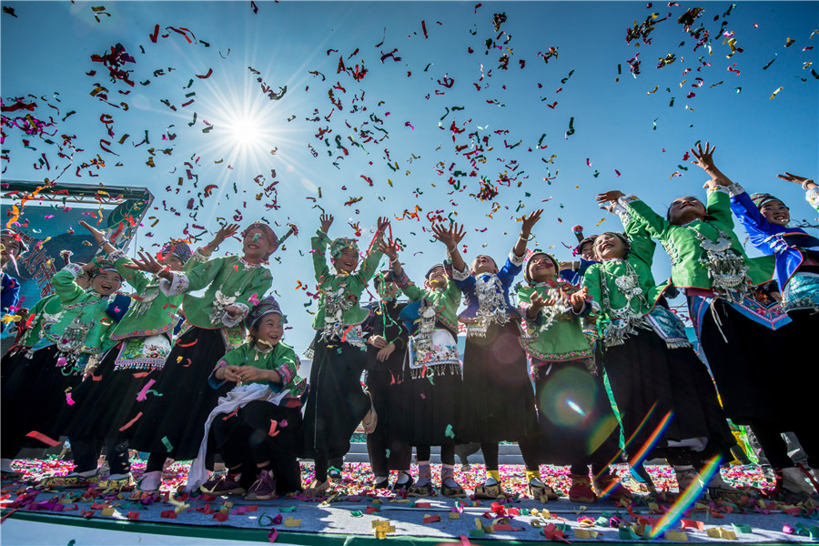 Celebrating, taken by Zhu Zhigang, shows people of Zhuang ethnic group in Guangnan county, Yunnan province. [Photo provided by cpanet.org.cn]