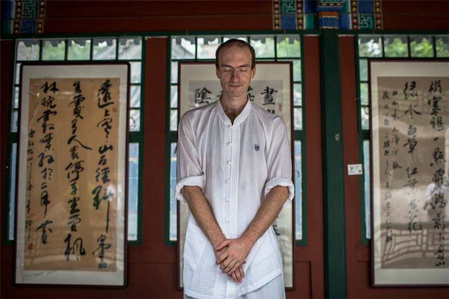 A tai chi master from Slovakia practices tai chi at White Cloud Temple in Beijing on Aug 16, 2017. [Photo by Roman Pilipey/cpanet.org.cn]