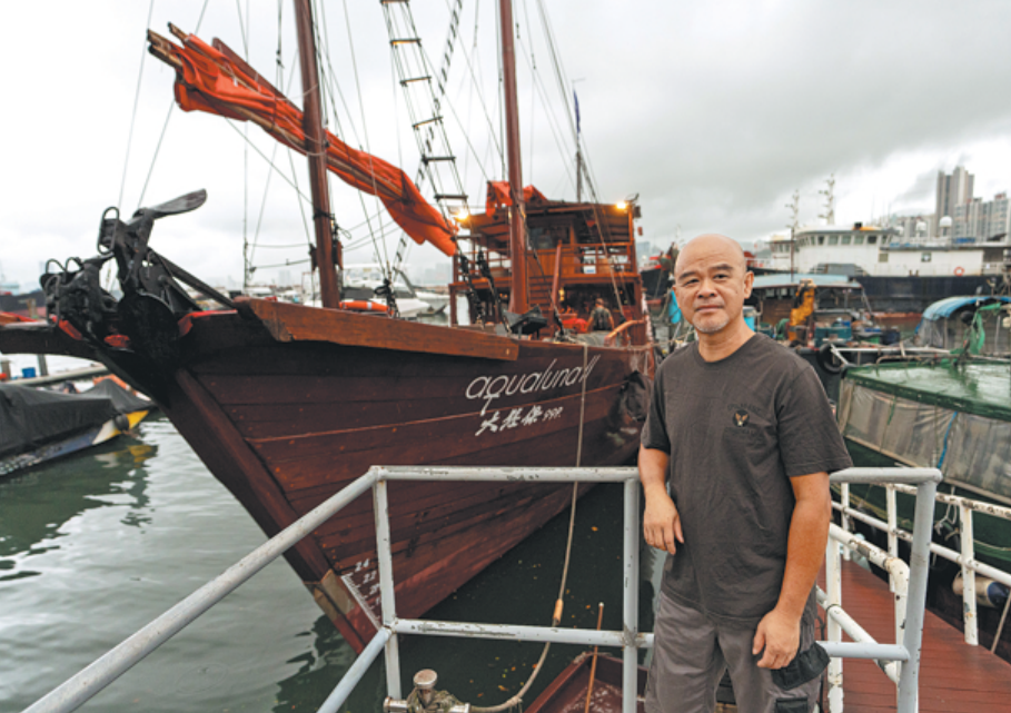 The Aqua Luna junk boat is a painstakingly handcrafted creation by Au Sai-kit, the third-generation owner of Hong Kong's Kwong Ming Shipyard, and his father. Tucked away in A Kung Ngam, Shau Kei Wan in the Eastern District of Hong Kong Island, the shipyard is a two-story tin-roofed building with a green sign reading "Kwong Ming Shipyard". Its dimly lit first floor, filled with wood and tools, leads to a small outdoor pier where the Aqua Luna, usually plying the waters of Victoria Harbour, was moored for routine maintenance on the day of the interview.