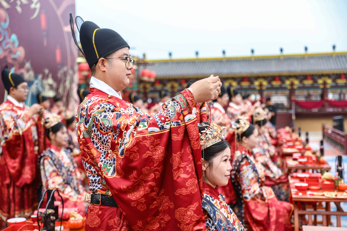 A group wedding ceremony featuring 28 couples in magnificent Hanfu costumes is held in Laoling, Dezhou, Shandong province, on Saturday. [Photo by Jia Peng/For chinadaily.com.cn]