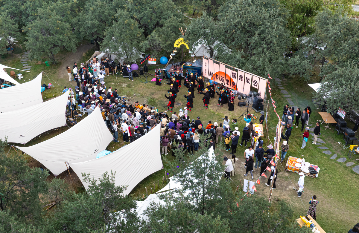An aerial drone photo taken on Sept 13, 2025 shows people attending a "Lingka" festival in Chonggyai county of Lhokha, Southwest China's Xizang autonomous region. [Photo/Xinhua]