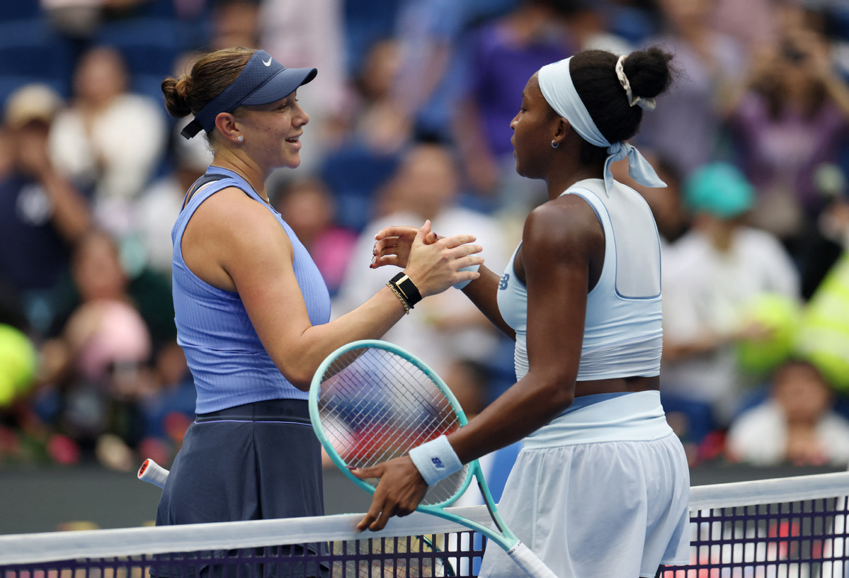 Amanda Anisimova of the US shakes hands with Coco Gauff of the US after winning her semi final match of China Open in Beijing, Oct 4, 2025. [Photo/Agencies]