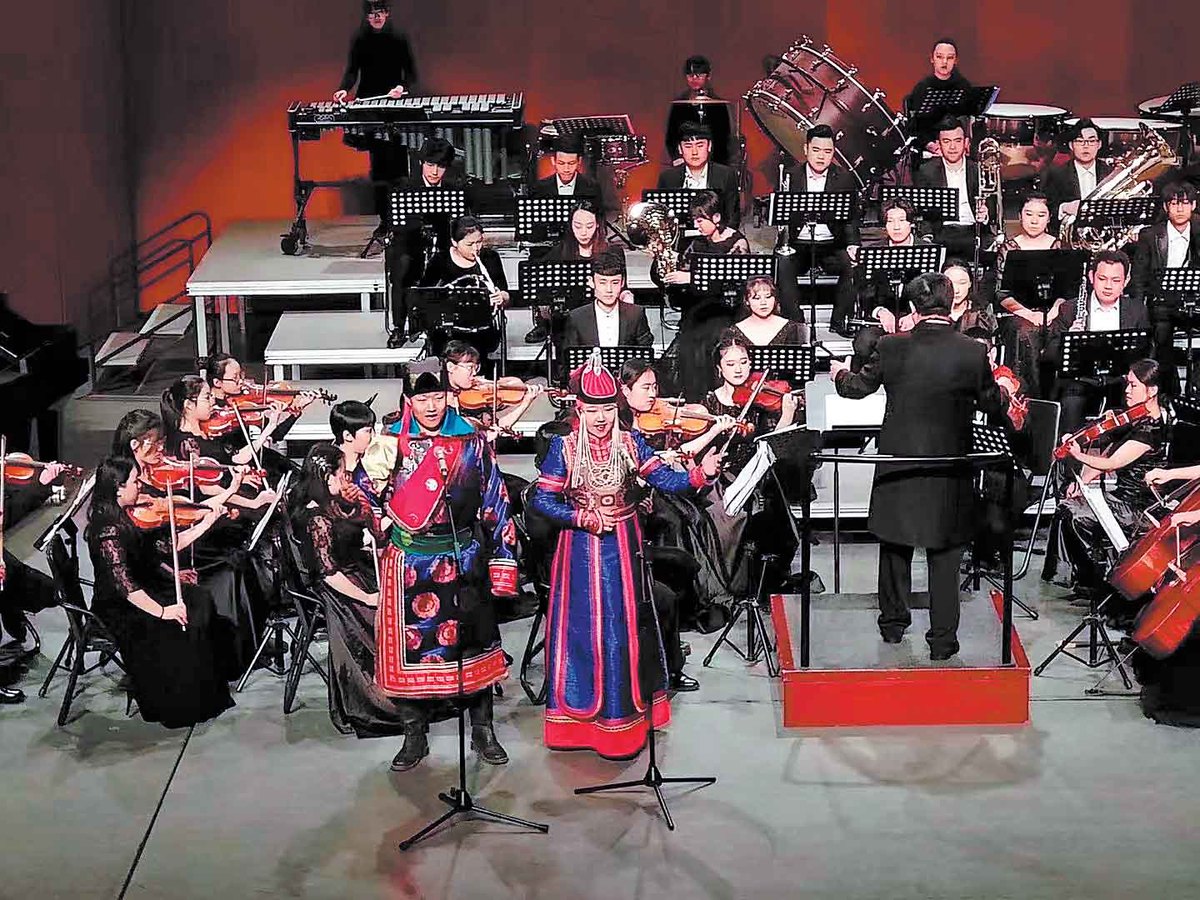 Bulga (front left) performs with a school orchestra at the theater of the Inner Mongolia Arts University in Hohhot, Inner Mongolian autonomous region. CHINA DAILY