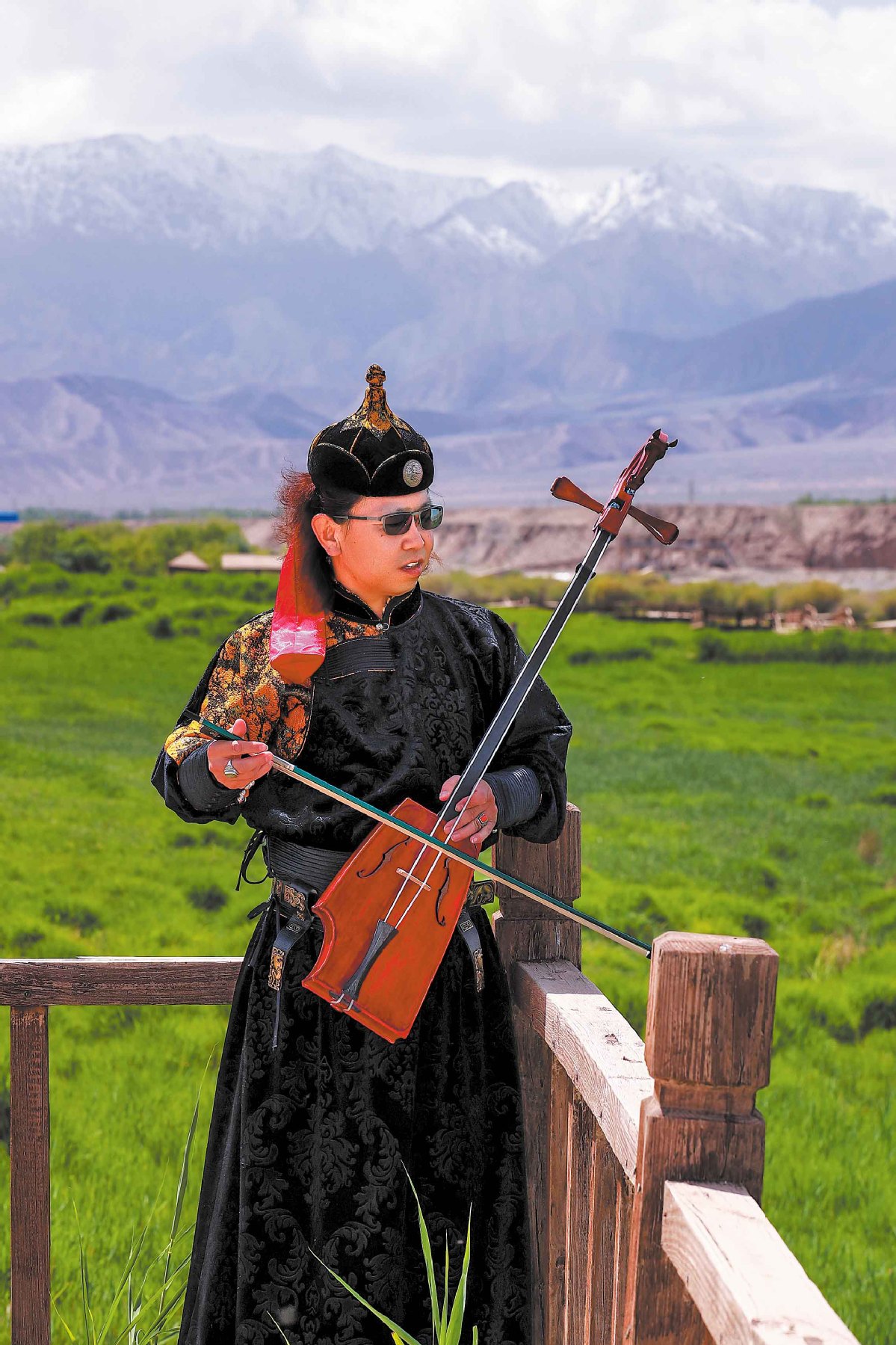 Qinbugele, a native Mongolian ethnic group in Subei, enjoys a moment of personal reflection after a performance on the grassland. CHINA DAILY