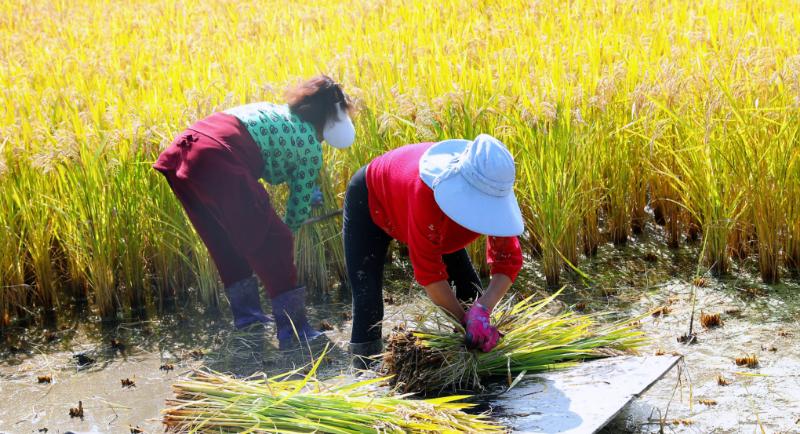 Farmers harvest rice in Longtou village of Tonghua city, Jilin province. [Photo by Zhang Tiebing/For chinadaily.com.cn]