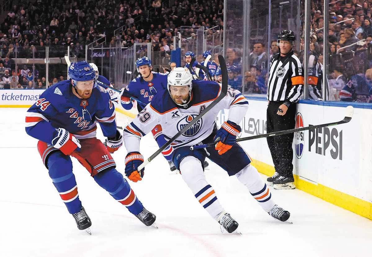 Vladislav Gavrikov (left) of the New York Rangers slows up Leon Draisaitl of the Edmonton Oilers — who has both players' sticks — during the third period on Tuesday in New York City. The Oilers shutout the Rangers 2-0. GETTY IMAGES VIA AFP
