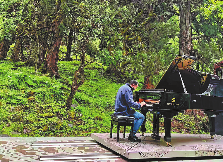 A visitor plays a grand piano during a drizzle in a primitive forest in the geopark. ERIK NILSSON/CHINA DAILY