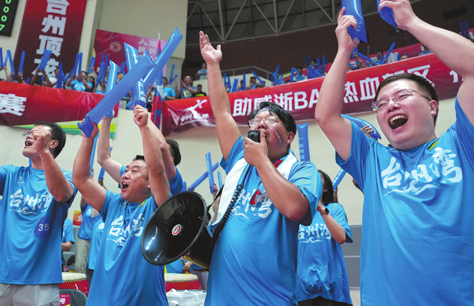 Wearing team T-shirts and carrying banners, Taizhou fans cheer during the ZheBA game against team Jiaxing. HUANG ZONGZHI/XINHUA