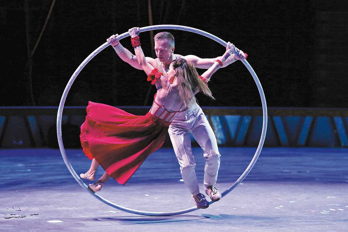The rehearsal performance Rose Cyr Wheel by the Polish duo acrobatic group on Sept 30. WU XIAOHUI/CHINA DAILY