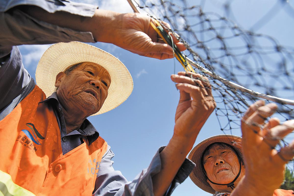 Song Hengchun and his wife repair nets used for collecting debris from the reservoir in Dongzhaozhuang village of Yiyuan county, Shandong province, on Sept 17. ZHAO DONGSHAN/CHEN MING/FOR CHINA DAILY