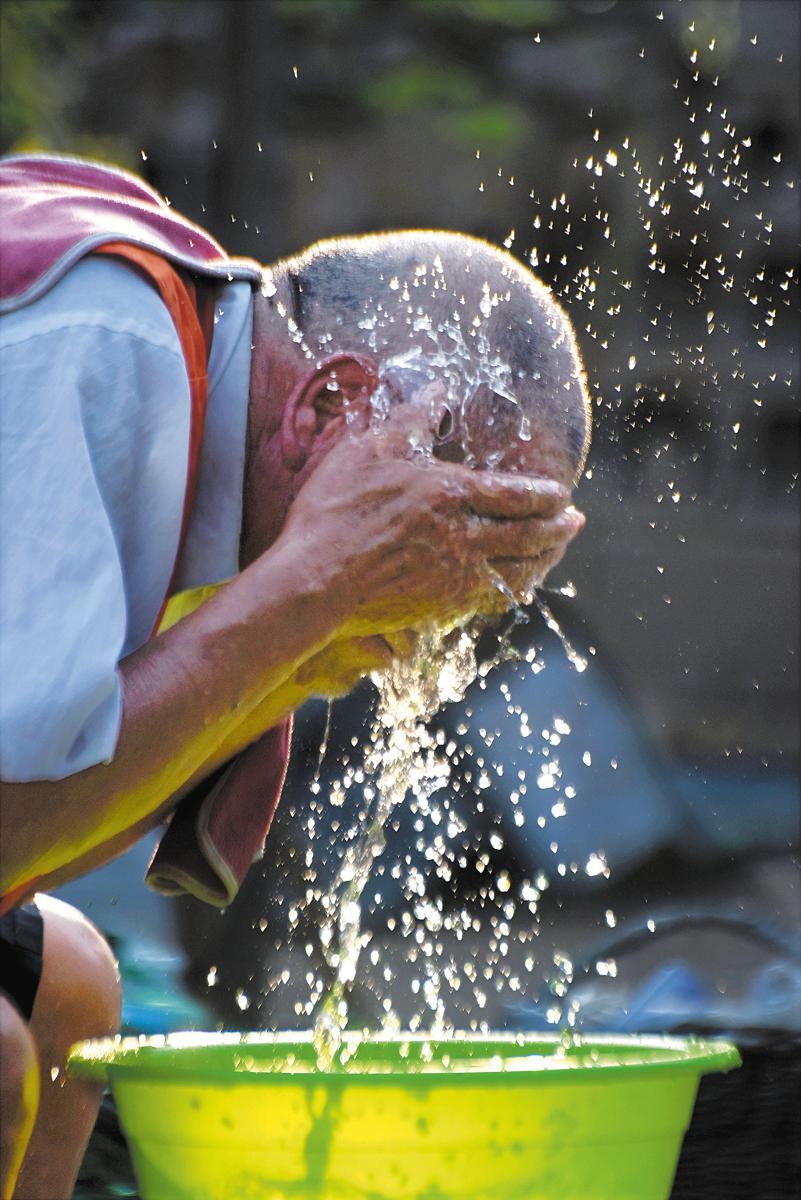 Song Hengchun washes his face after a tiring patrol in Dongzhaozhuang village of Yiyuan county, Shandong province, on Aug 7. ZHAO DONGSHAN/CHEN MING/FOR CHINA DAILY
