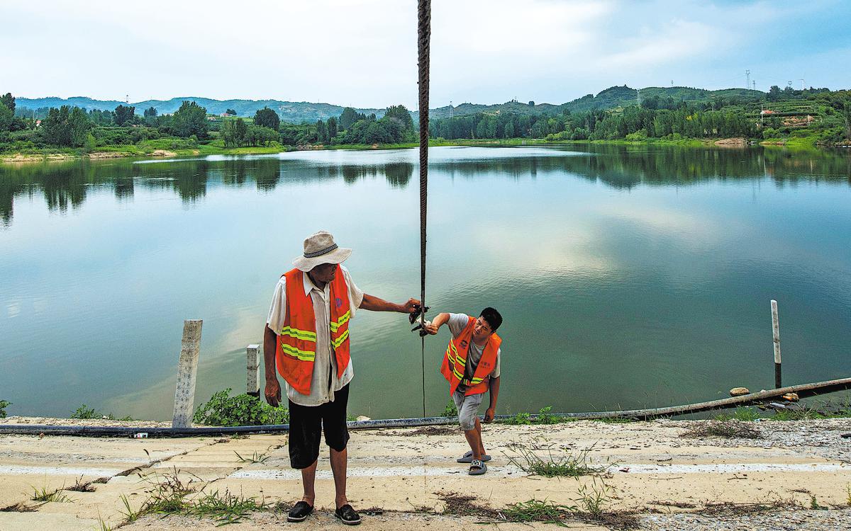 Song Hengchun (left) checks the spillway gate's steel wire rope with his son in Dongzhaozhuang village of Yiyuan county, Shandong province, on Aug 11. ZHAO DONGSHAN/CHEN MING/FOR CHINA DAILY