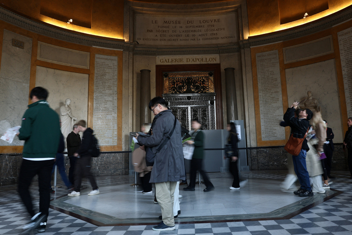Visitors walk past the closed Galerie d'Apollon where eight pieces of Napoleon and the Empress's jewelry collection displayed in the gallery were stolen by thieves, at the Louvre Museum on the day it reopened to the public for the first time since last Sunday's heist, in Paris, France, Oct 22, 2025. [Photo/Agencies]