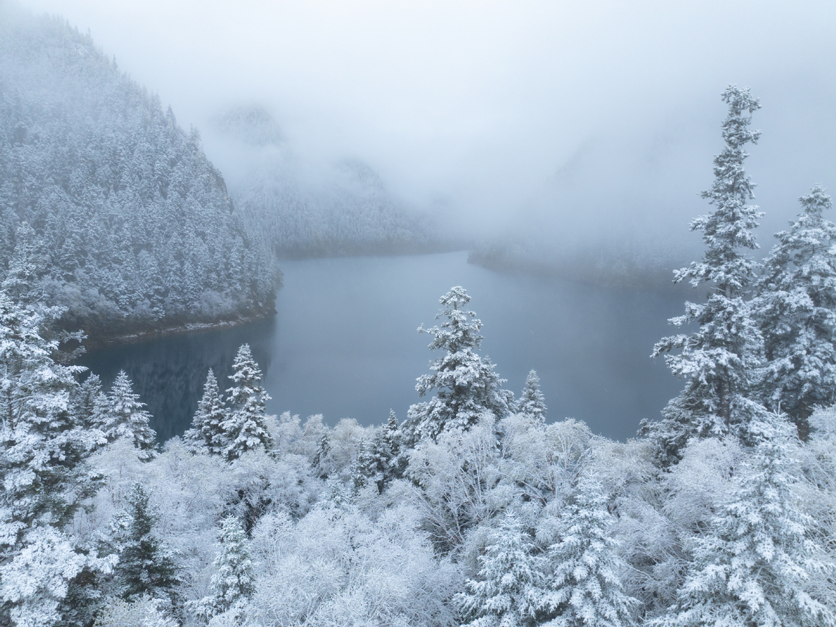 An aerial drone photo taken on Oct 24, 2025 shows a view of the Jiuzhaigou scenic spot after snow in Southwest China's Sichuan province. [Photo/Xinhua]