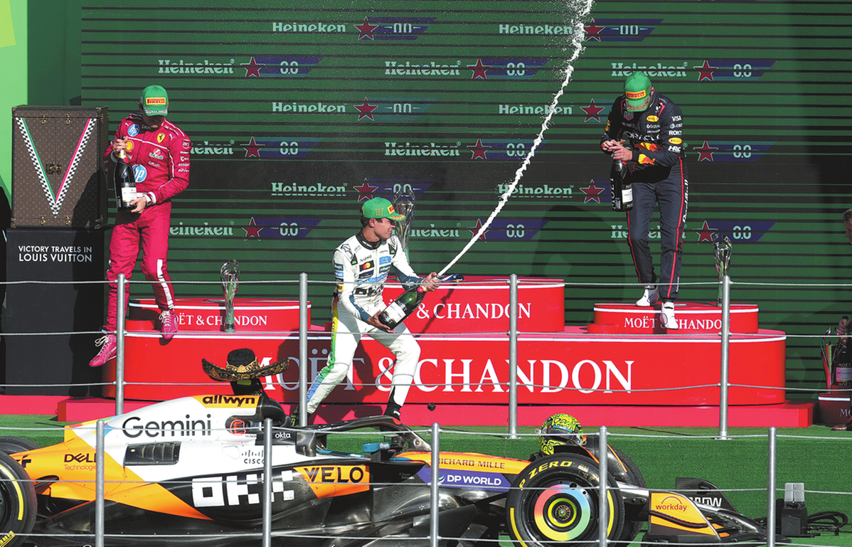 McLaren driver Lando Norris of Britain celebrates on the podium with Red Bull driver Max Verstappen of the Netherlands (right) and Ferrari driver Charles Leclerc of Monaco after winning the Formula One Mexico Grand Prix in Mexico City on Sunday. AP
