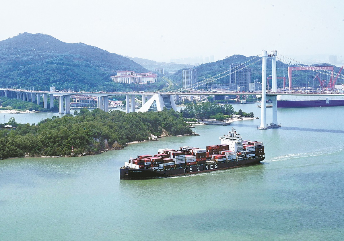A container ship departing from Xiamen Port passes near Haicang Bridge in Xiamen, Fujian province, on Aug 6, 2024. Xiamen Port has made its fully intelligent transformation in recent years. LIN SHANCHUAN/XINHUA