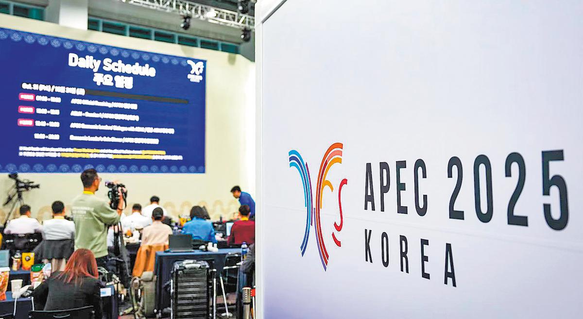Journalists work at the media center of the APEC meeting in Gyeongju on Friday. JIA HAOCHENG/XINHUA