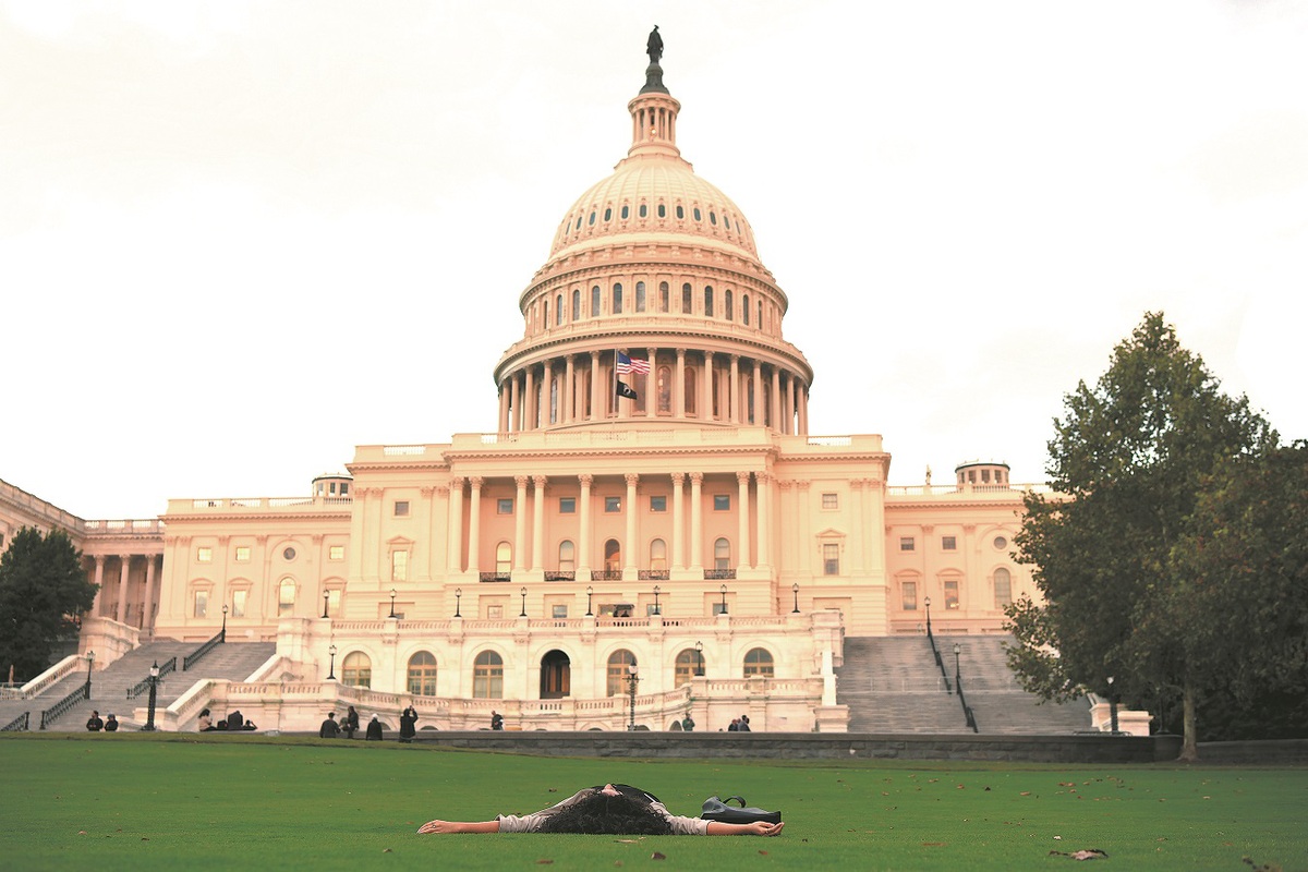 A woman lies down on a lawn in front of the US Capitol building in Washington, DC, the United States, on Oct 15. LI RUI/XINHUA