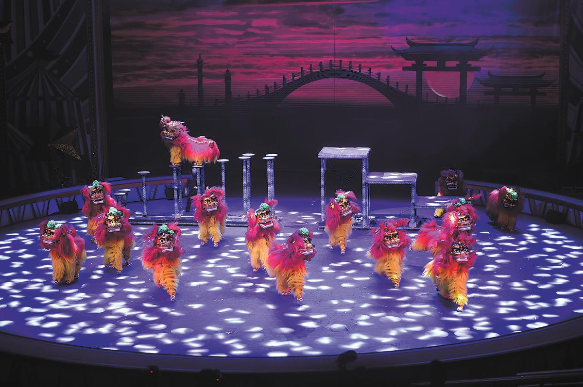 Acrobats stage the lion dance performance titled Auspicious Lions Leap Across the Land during the 20th China Wuqiao International Circus Festival in Wuqiao county, Hebei province, last month. [Photo provided to CHINA DAILY]