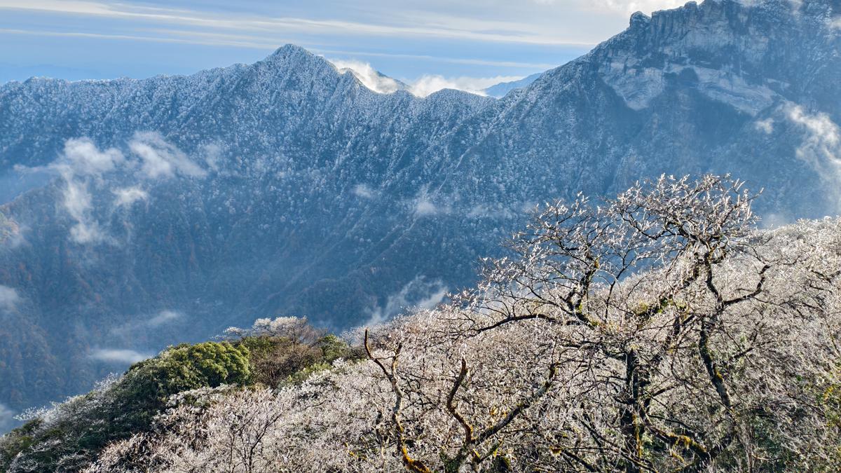 A cold snap coated the red leaves on Fanjing Mountain in Guizhou province with rime, turning the peaks white.