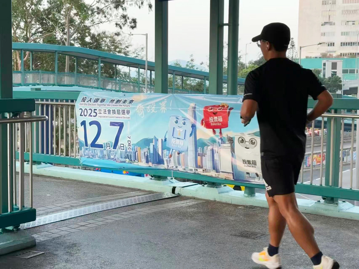 A jogger runs past a poster of Hong Kong's 2025 Legislative Council General Election on a foot-over bridge in Hong Kong Island on Dec 7, 2025, the election day. [SHAMIM ASHRAF/CHINA DAILY]