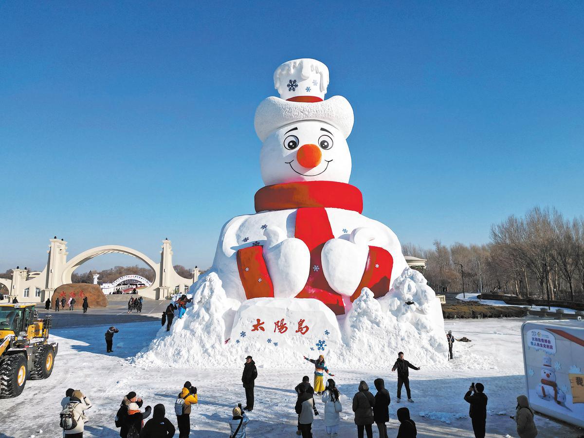 Tourists pose for photos with a gigantic snowman, which was officially unveiled at the Sun Island scenic spot in Harbin, Northeast China's Heilongjiang province, Dec 9, 2025. The Mr Snowman sculpture stands 23.8 meters tall and is made with 5,000 cubic meters of snow. LIU YANG/FOR CHINA DAILY