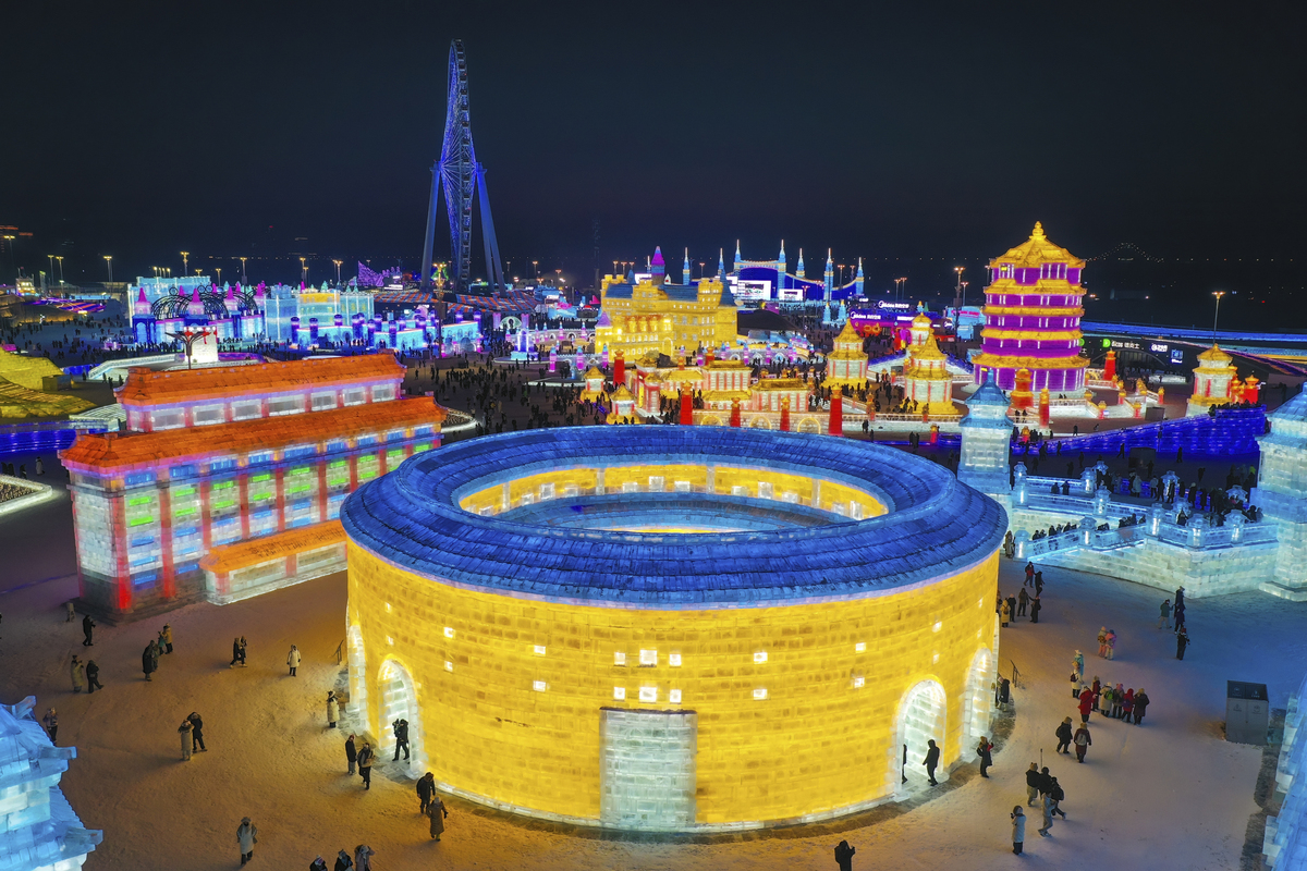 Ice sculptures are seen at the Harbin Ice-Snow World in Harbin, Northeast China's Heilongjiang province. [Photo by Tian Weitao/China Daily]