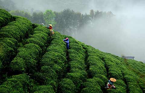 Farmers work at a tea garden in Zhaoping county, Hezhou city, Guangxi Zhuang autonomous region, Mar 15, 2015. [Photo/IC] |