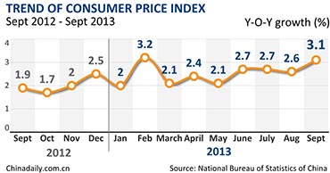 China's seven-month-high Consumer Price Index of 3.1 percent in September indicated a sharp rise in inflation pressure, analysts said.