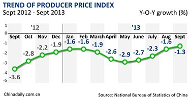 China's producer price index (PPI) fell 1.3 percent in September from the same month last year, the National Bureau of Statistics said Monday.