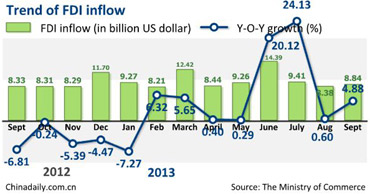 China's foreign direct investment in September rose 4.88 percent from a year earlier to $8.84 billion, higher than the 0.62-percent growth in August.