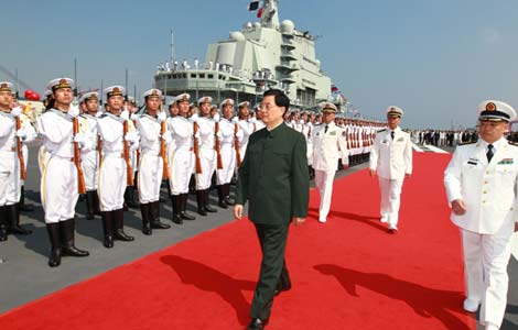 China's first aircraft carrier will escort China's further implementation of its peaceful development strategy and pose no threat to other countries.
