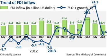 Foreign direct investment into China maintained its momentum in August, adding to signs of an upturn in the economy and growing investor confidence.