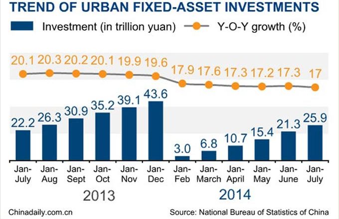 China's fixed asset investment rose 17 percent year on year to 25.9 trillion yuan ($4.2 trillion) in the first seven months of 2014, the National Bureau of Statistics (NBS) said.