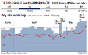 About 5 billion cubic meters of water will be discharged from the Three Gorges Dam over the next 20 days to ease the severe drought in the middle and lower reaches of the Yangtze River.