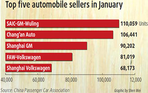 China's automobile market continued its robust growth in January, with sales surging 84 percent from a year earlier, heavily boosted by minivans, China Passenger Car Association said on Friday.