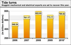 Exports of mechanical and electrical products, which account for more than half of the nation's export volume, are expected to increase by 10 percent in 2010, a senior government official said yesterday.