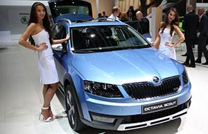 Models are pictured next to a Skoda Vision C concept car at the 84th International Geneva Motor Show, in Geneva, Switzerland on March 4, 2014.