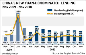 New yuan-denominated lending in China in November dropped to 564 billion yuan ($84.8 billion) from 587.7 billion yuan in October, the People's Bank of China (PBOC), China's central bank, said Friday.