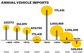 Vehicle imports slumped 10.7 percent in the first half, to 526,000 units, as the domestic demand slowdown of the past two years drove up inventories of foreign cars.