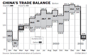 China is "highly likely" to see more trade deficits in the coming months after it reported a surprise February deficit, the biggest in 7 years, due to slowing overseas demand and rising commodity prices, economists said.