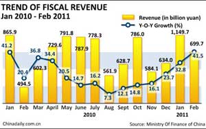 China's fiscal revenue jumped 41.5 percent year-on-year in February to 699.7 billion yuan ($106.5 billion), the Ministry of Finance (MOF) said Monday.