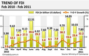 Foreign direct investment (FDI) into China accelerated by 32.2 percent year-on-year to $7.8 billion in February, the Ministry of Commerce (MOC) said Tuesday.