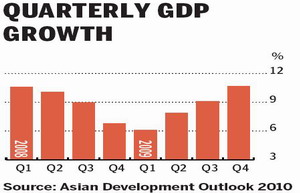 The Asian Development Bank (ADB) on Tuesday lifted its forecast for China's 2010 gross domestic product (GDP) growth, but said the figures may cool slightly in 2011 due to monetary tightening measures.